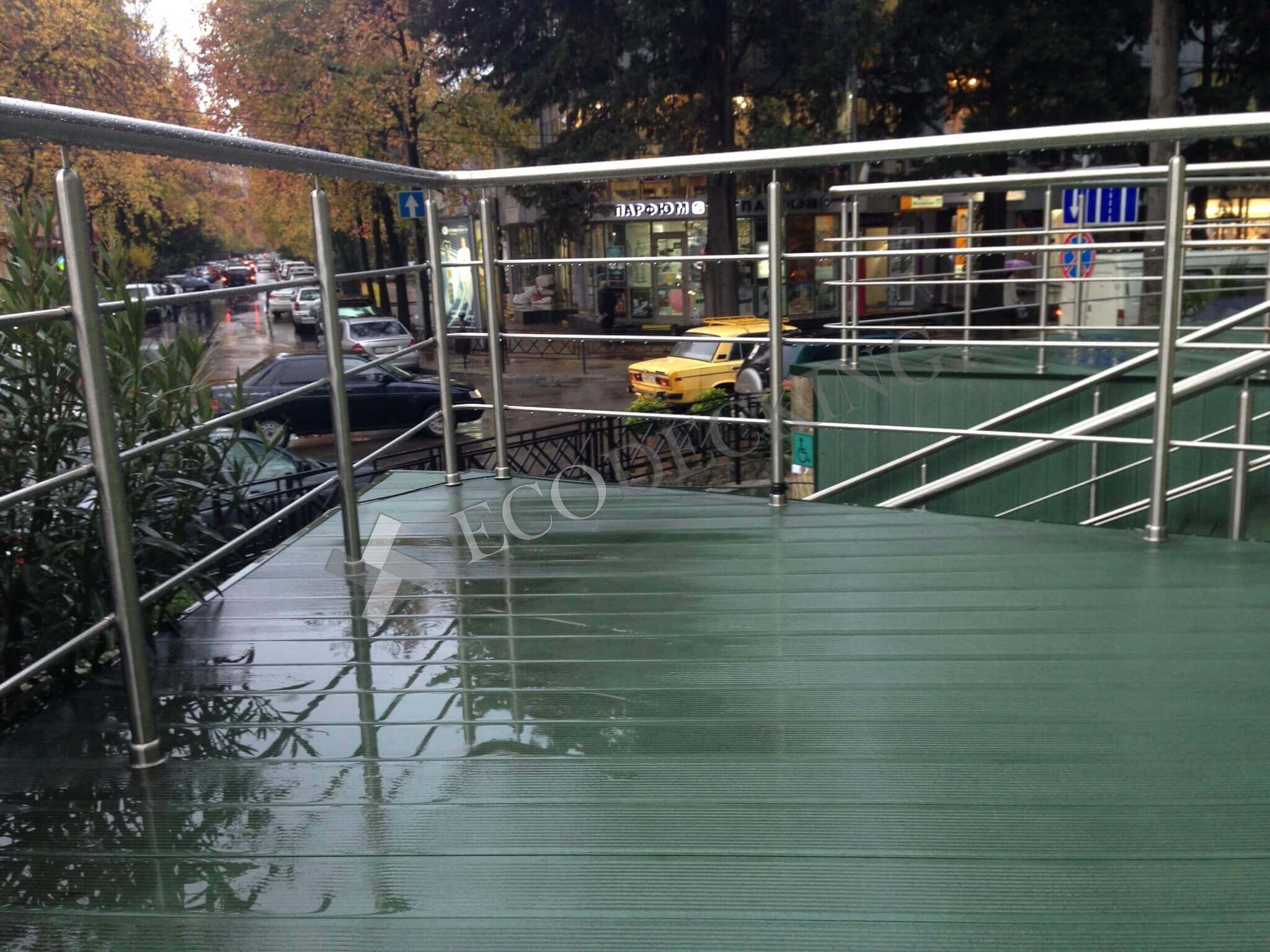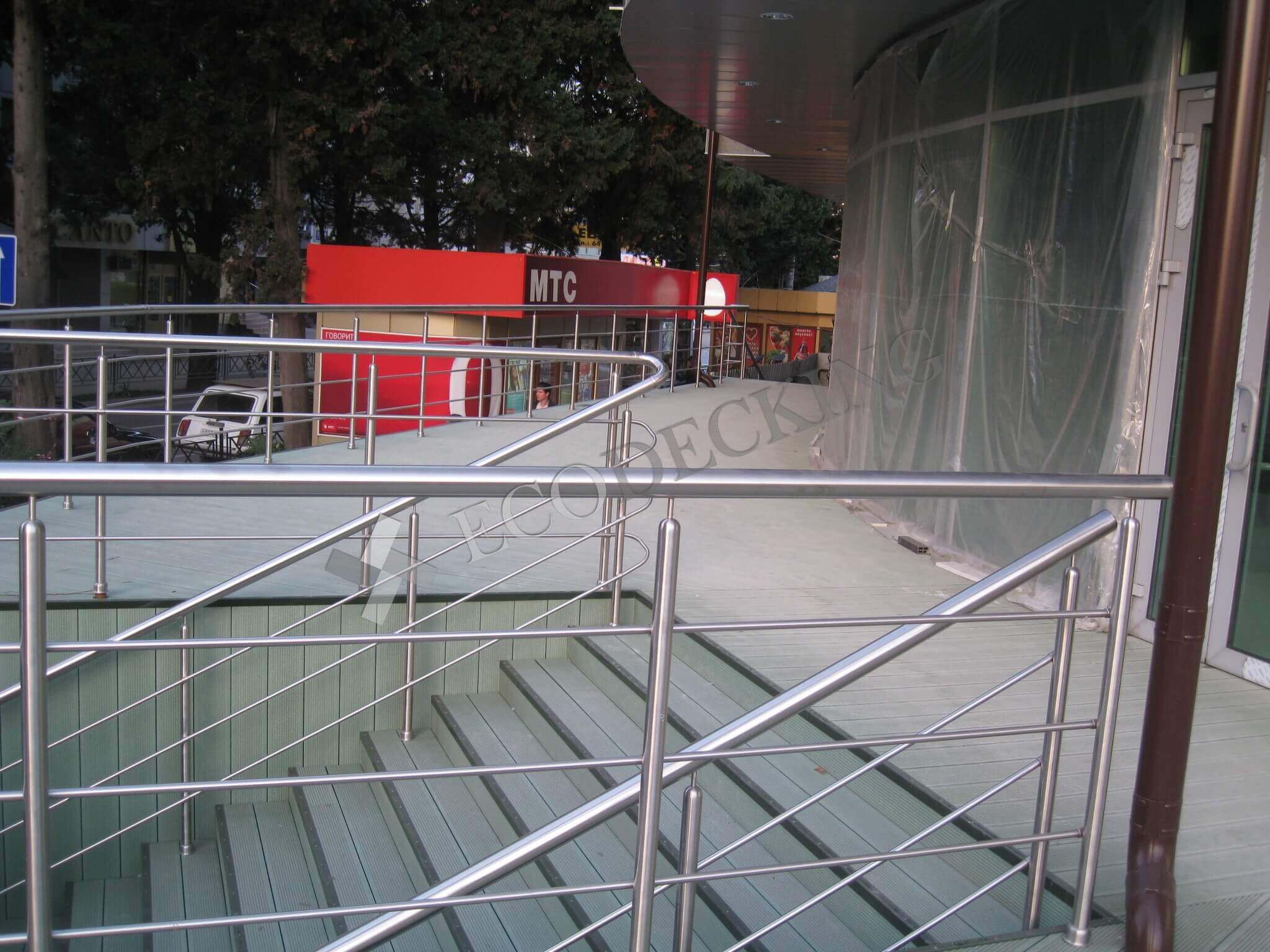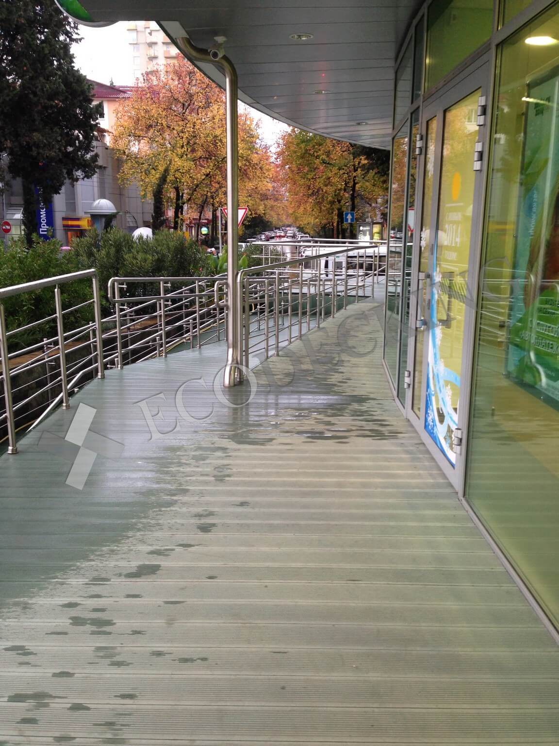 Этот объект - подтверждение нашей многолетней качественной работы. Монтаж входной группы в отделение банка мы произвели в далеком 2011 году. Это место с высоким трафиком людей. Террасная доска находится под открытым небом, и спокойно переносит все погодные изменения на протяжении многих лет. На этом примере прекрасно видно, что террасная доска из древесно-полимерного композита действительно презентабельно выглядит даже спустя годы использования и отвечает всем заявленным характеристикам по влагостойкости, устойчивости к УФ-лучам, перепадам температуры. До настоящего времени этот объект все так же эксплуатируется, а смонтированное нашими сотрудниками покрытие достойно переносит интенсивные нагрузки в не самых простых климатических условиях.