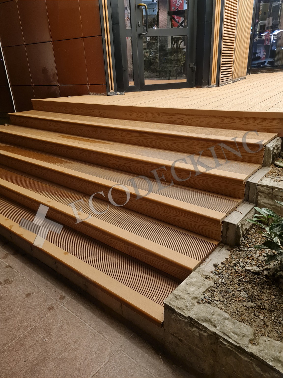 Террасная доска Ecodecking Техно размером 132х20 цвета Бронза и ступени на террасе ресторана. Монтаж производили 02.2021